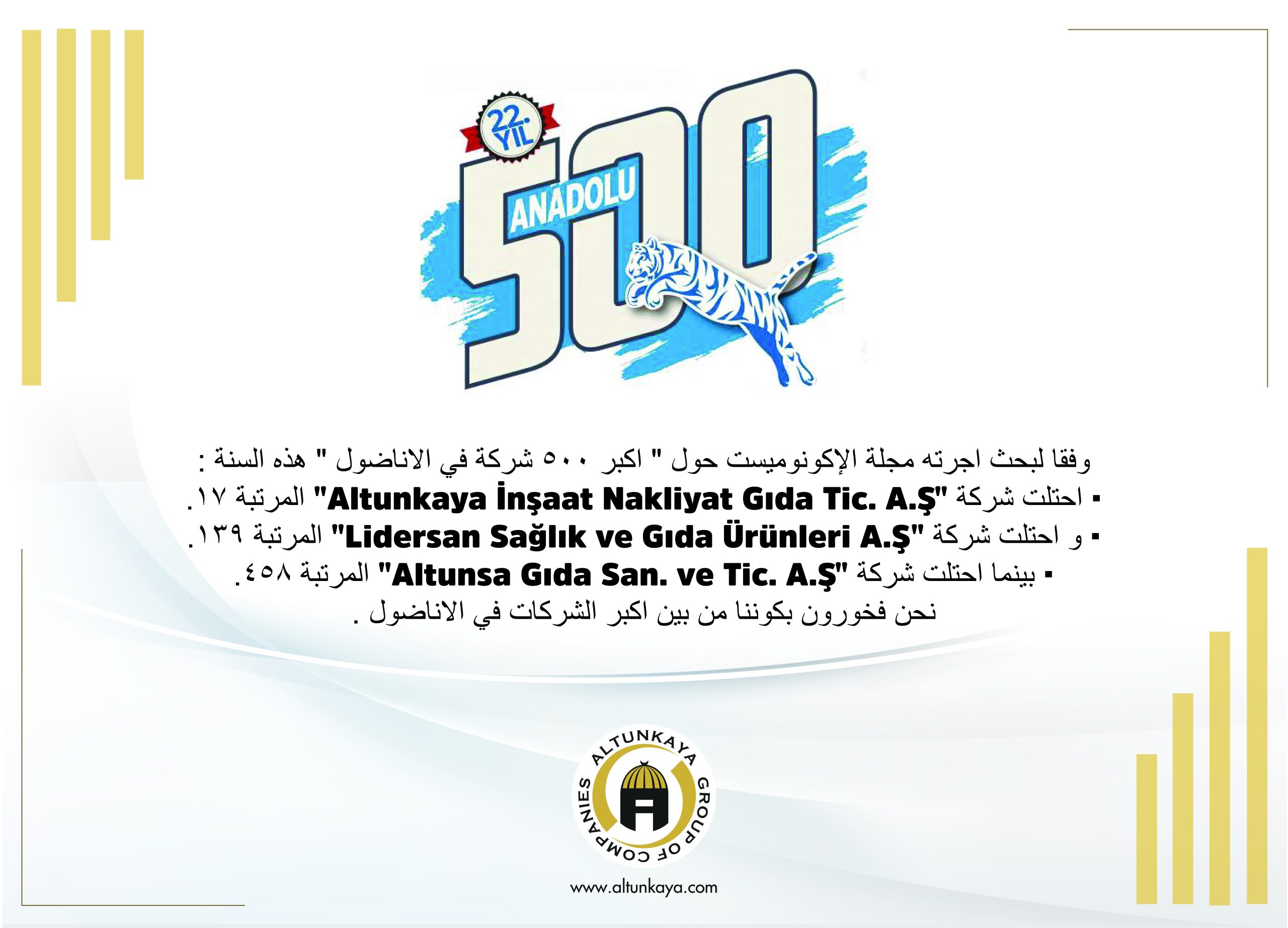 في بحث مجلة "إيكونوميست" حول "أكبر 500 شركة في الأناضول" لهذا العام: • احتلت شركة Altunkaya İnşaat Nakliyat Gıda Tic. A.Ş. المرتبة 17، • واحتلت شركة Lidersan Sağlık ve Gıda Ürünleri A.Ş. المرتبة 139، • بينما جاءت شركة Altunsa Gıda San. ve Tic. A.Ş. في المرتبة 458. نحن فخورون بتواجدنا ضمن أكبر الشركات في الأناضول.